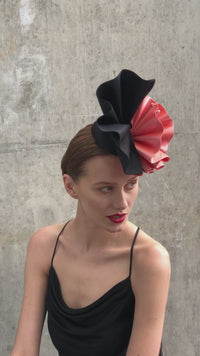 A statement headpiece that celebrates a sense of freedom and fantasy, immaculately constructed from silk in a pleated structure that sits on a small base.